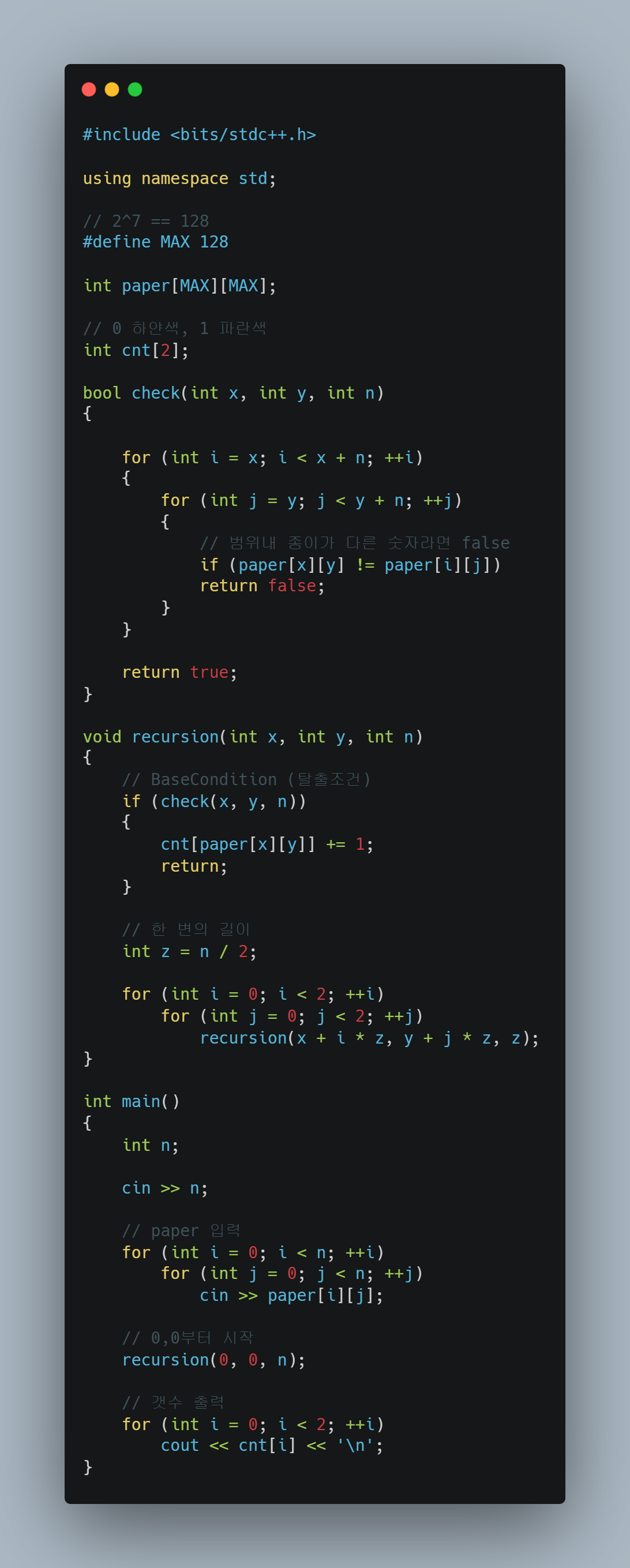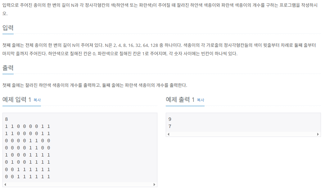 [BJ] 2630 - 색종이 만들기 (재귀 분할정복) 본문