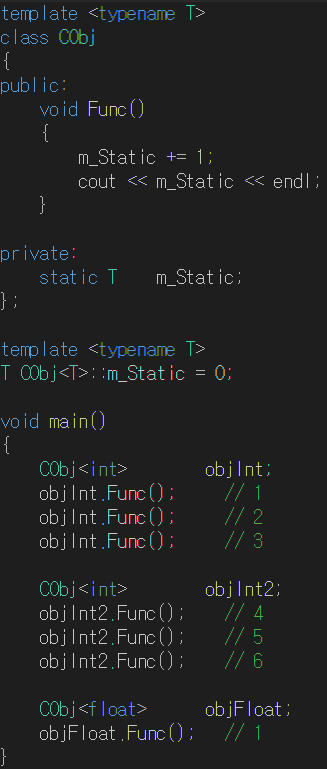 -> 같은 자료형을 사용하는 템플릿 클래스끼리만 static 변수를 공유한다.