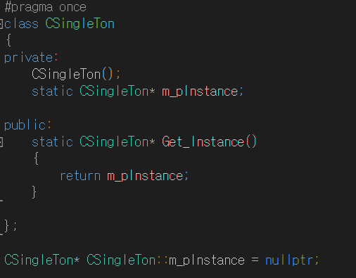 6. m_pInstance를 초기화 해주기 위해서는 static 멤버 변수 이므로, 생성자가 아닌 클래스 외부에서.