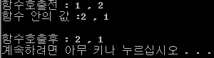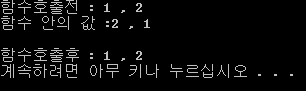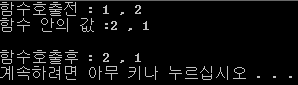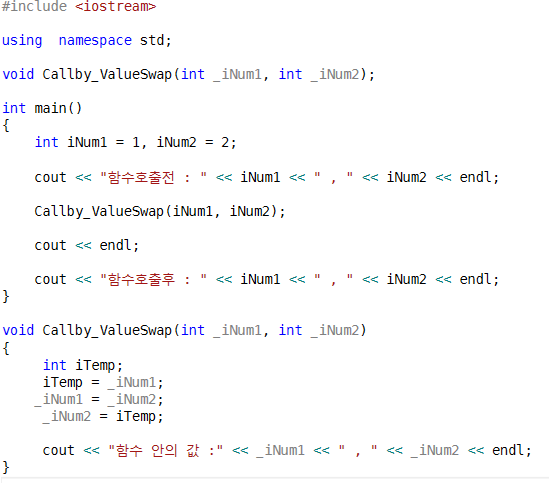 -> 그 이유는, Callby_ValueSwap 함수의 매개변수 값인 _iNum1과 _iNum2의 값이 바뀌었지 정작