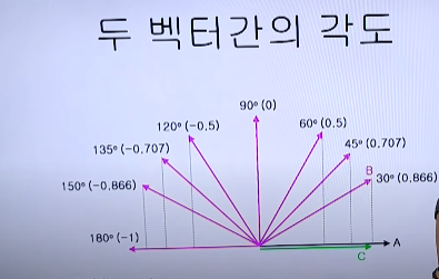 A백터와 B의 내적은 백터 A * 백터 B * 코사인세타 이다