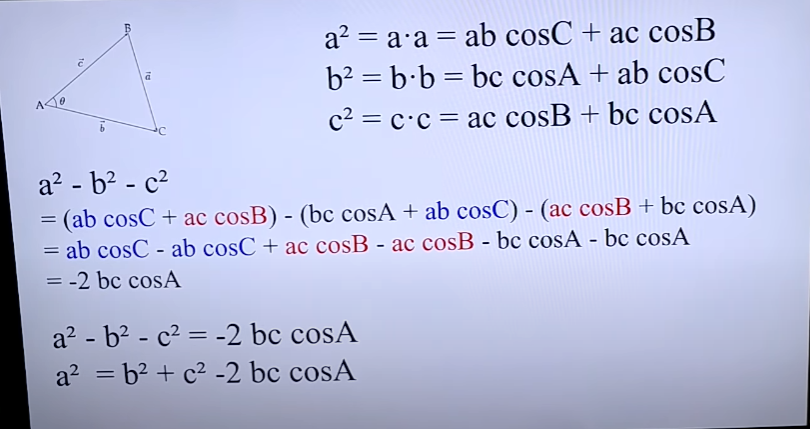 A백터의 제곱은 B백터제곱 + C백터 제곱 - 2*b*c * 코사인 A