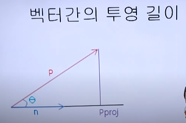 백터의 내적은 이 두 백터간에 서로 투영되는 길이를 나타내는 의미도 가진다.