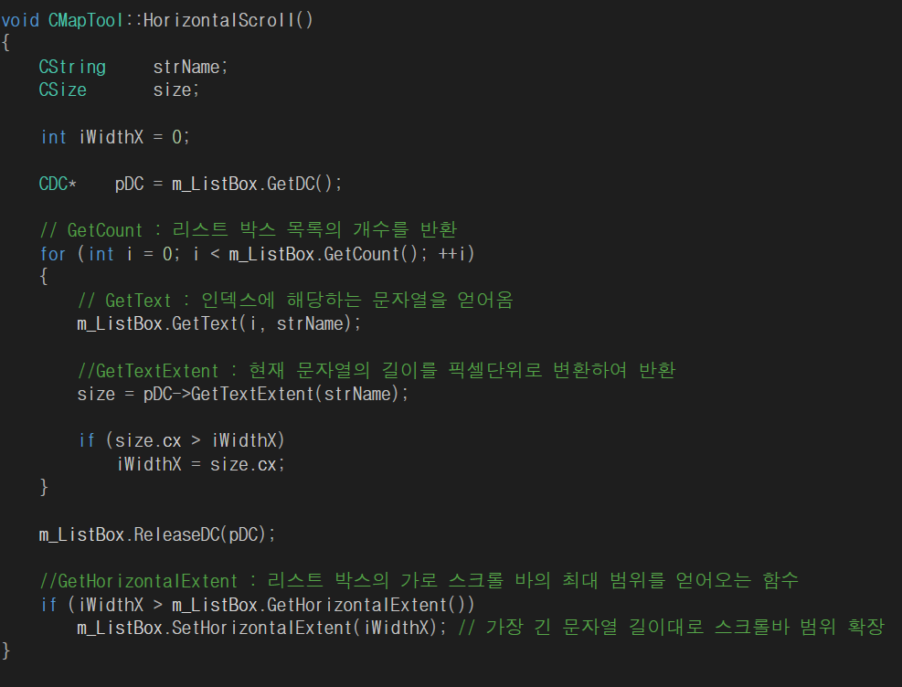 우선 HorizontalScroll함수부터 만들겟다. 가장긴 문자열을 찾아 그녀석을 기준으로 가로 스크롤바를