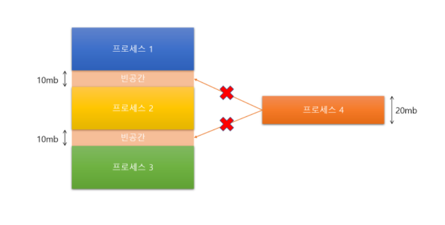 메모리의 크기를 할당할 수 있음에도 불구하고 연속적인 공간이 아니라서 할당을 하지 못하는 경우다.